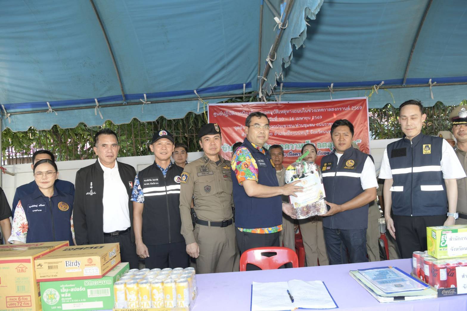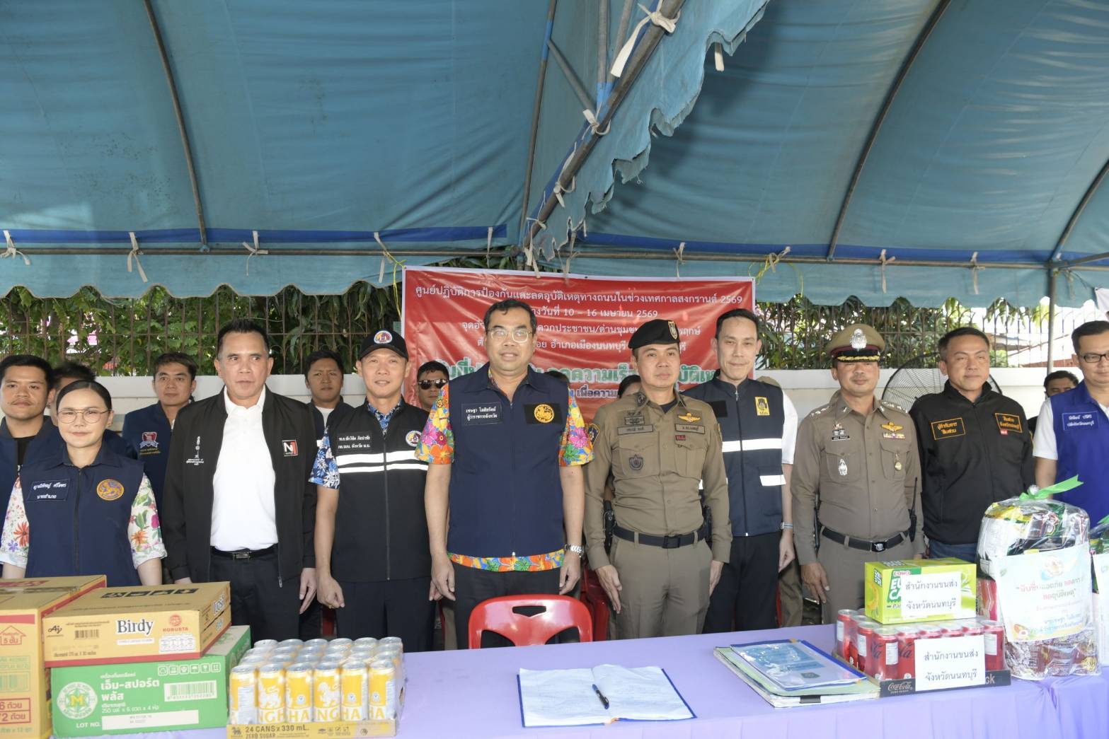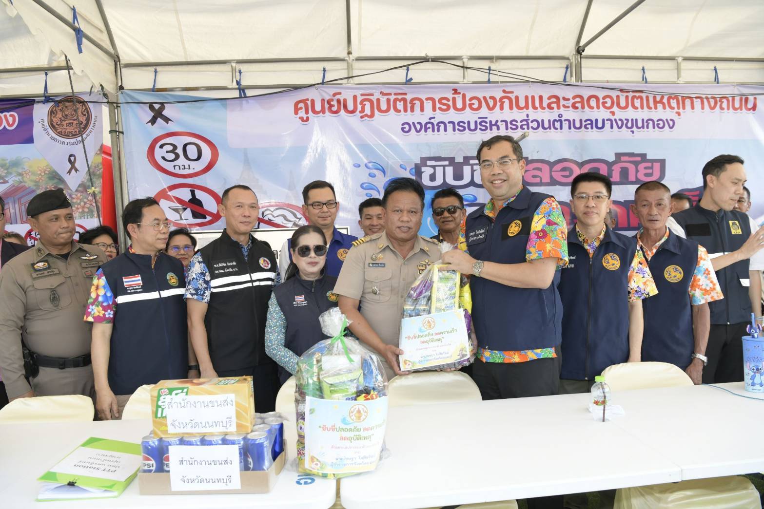 ในการนี้ ผู้ว่าราชการจังหวัดนนทบุรีได้ให้ความสำคัญกับการรณรงค์ความปลอดภัยบนท้องถนนเชิงรุก โดยได้ทำการมอบหมวกนิรภัยให้แก่ประชาชนที่ขับขี่รถจักรยานยนต์สัญจรผ่านจุดตรวจ เพื่อเป็นการกระตุ้นเตือนให้ตระหนักถึงความปลอดภัยและสร้างวินัยจราจรในการป้องกันตนเองจากอุบัติเหตุ พร้อมทั้งมอบสิ่งของบำรุงกำลังใจและน้ำดื่มให้แก่เจ้าหน้าที่ผู้เสียสละปฏิบัติงานในช่วงวันหยุดเทศกาล ณ จุดตรวจสำคัญ 3 จุด ได้แก่ 1. บริเวณถนนราชพฤกษ์ ก่อนทางเข้า รพ.สต. หมู่ 5 ต.บางรักน้อย อ.เมืองนนทบุรี 2. บริเวณหน้าปั๊ม ปตท.นครอินทร์ ถ.นครอินทร์ (มุ่งหน้าถ.กาญจนาภิเษก) ต.บางขุนกอง อ.บางกรวย 3. บริเวณหน้าเทศบาลเมืองบางพลับ ถ.ชัยพฤกษ์ ต.บางพลับ อ.ปากเกร็ด